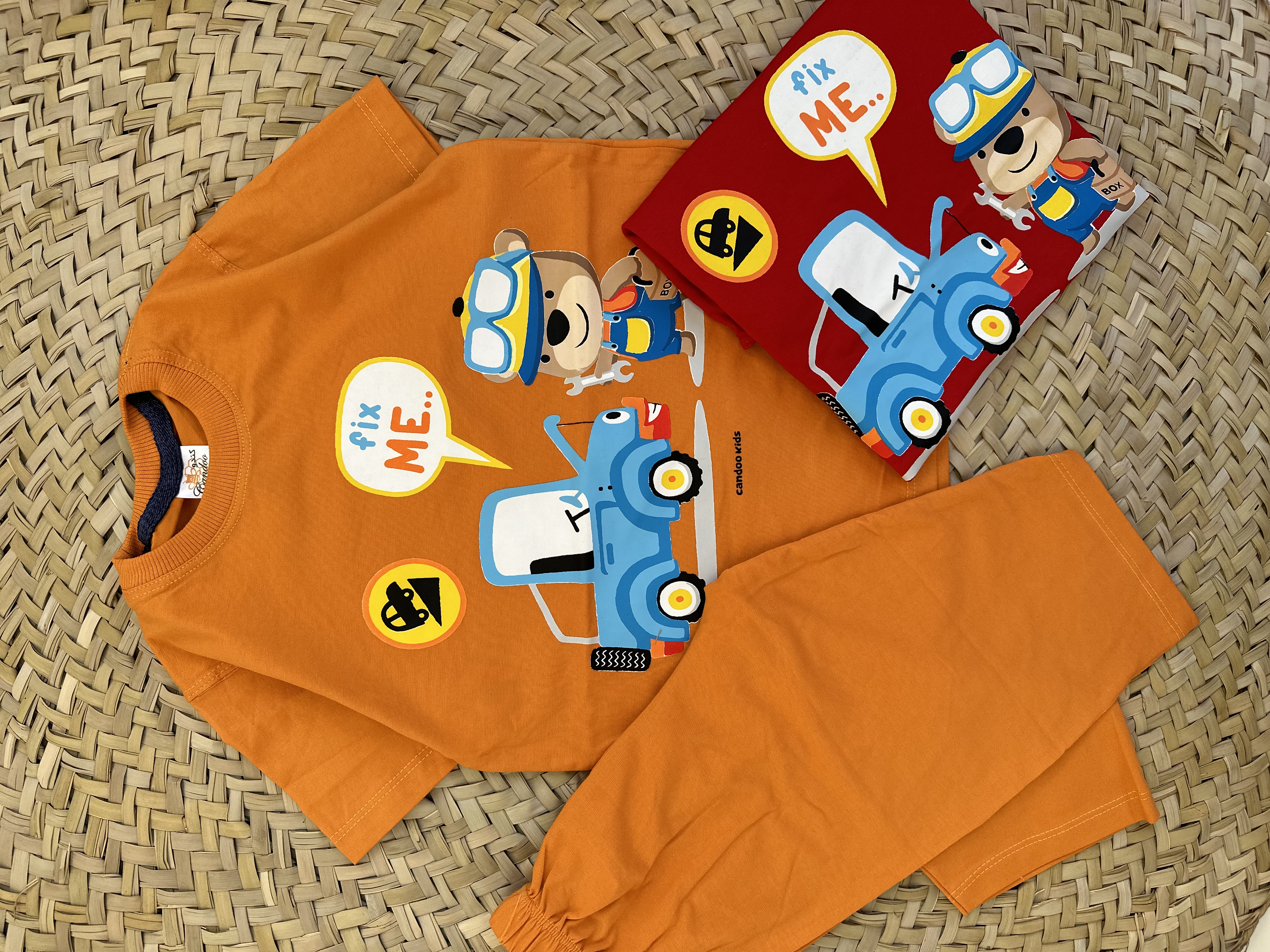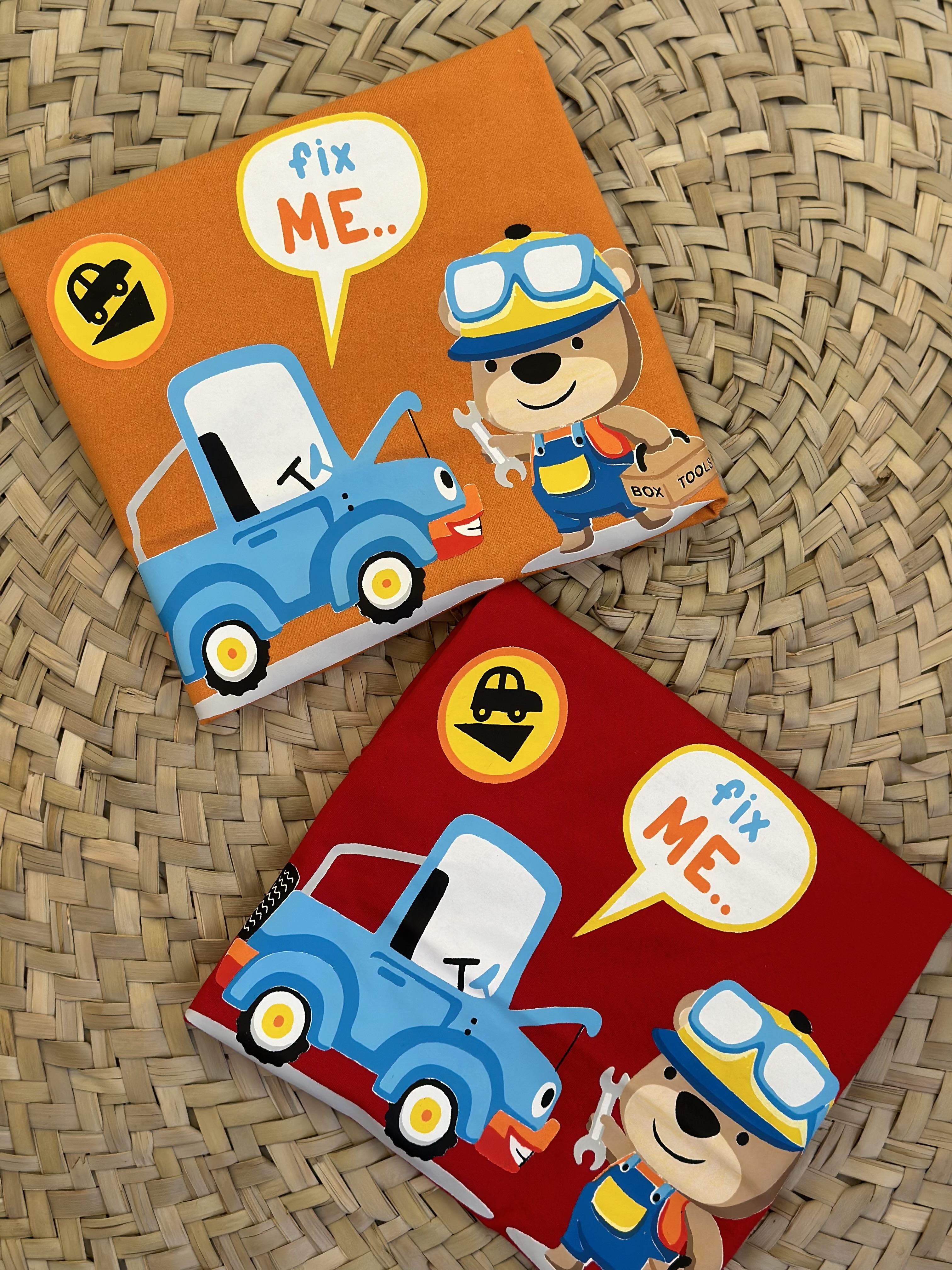 تیشرت شلوارک اسپرت،مناسب ۱تا۸سال،طرح تدی مکانیک،نخ پنبه ای،رنگ قرمز و نارنجی